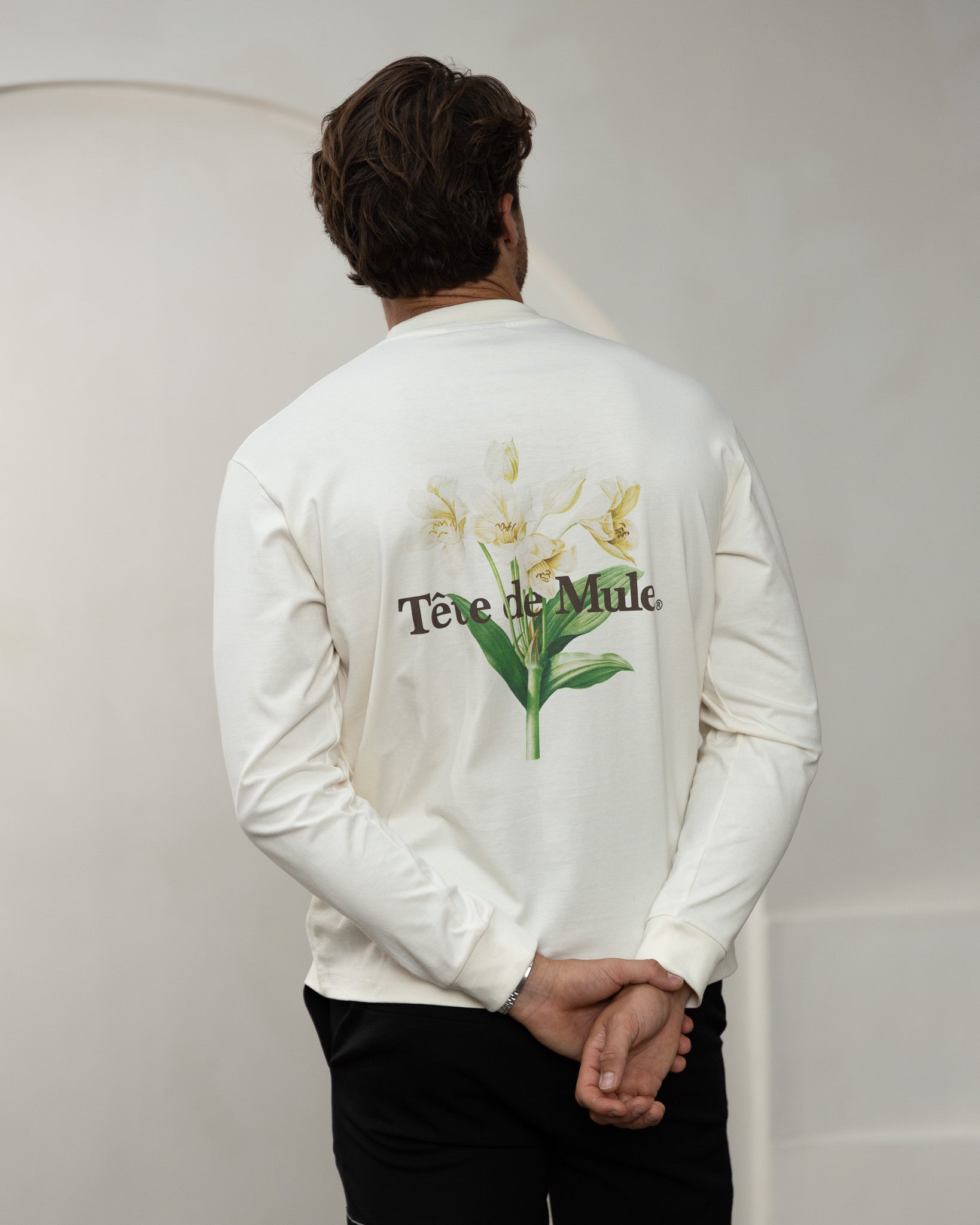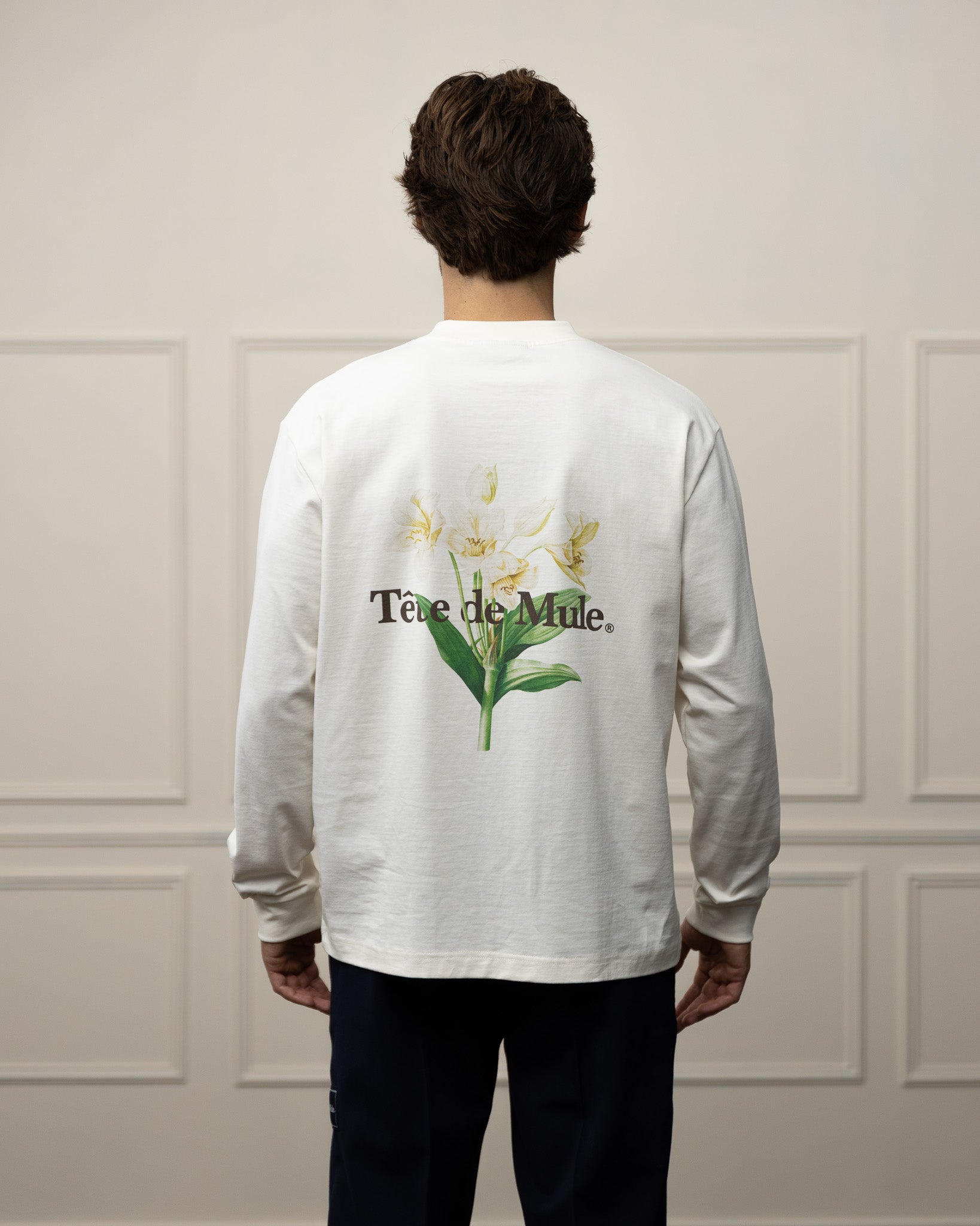 Oversized long sleeve t-shirt in pure cotton jersey featuring a back print of the hotel lobby flowers artwork.